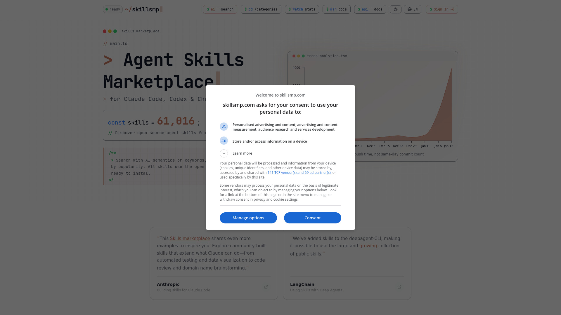 A marketplace for finding and exploring open-source AI agent skills.