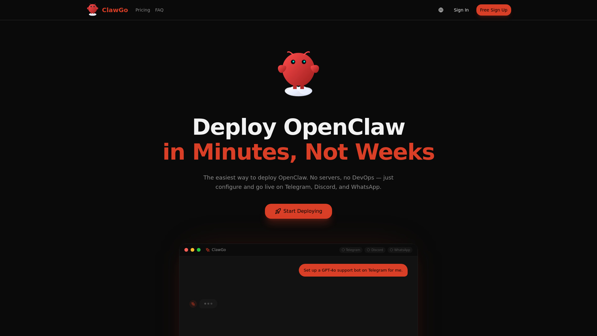 Managed hosting to deploy AI chatbots on Telegram, Discord, and WhatsApp without managing servers.
