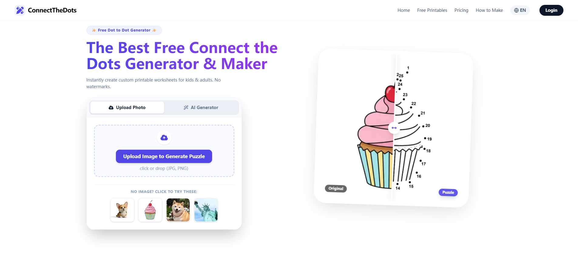 AI-powered tool to create custom printable dot-to-dot puzzles from images or text prompts.
