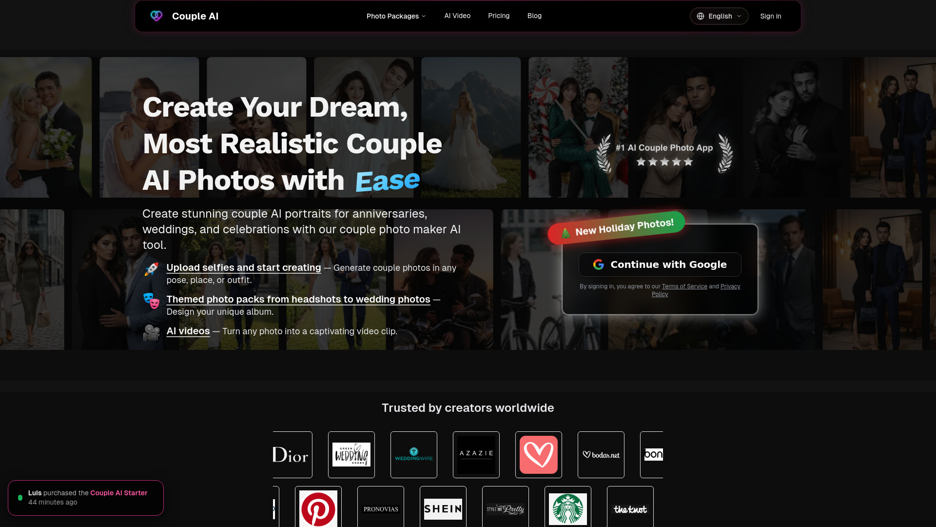 AI tool generating realistic professional couple photos from individual selfies in seconds.