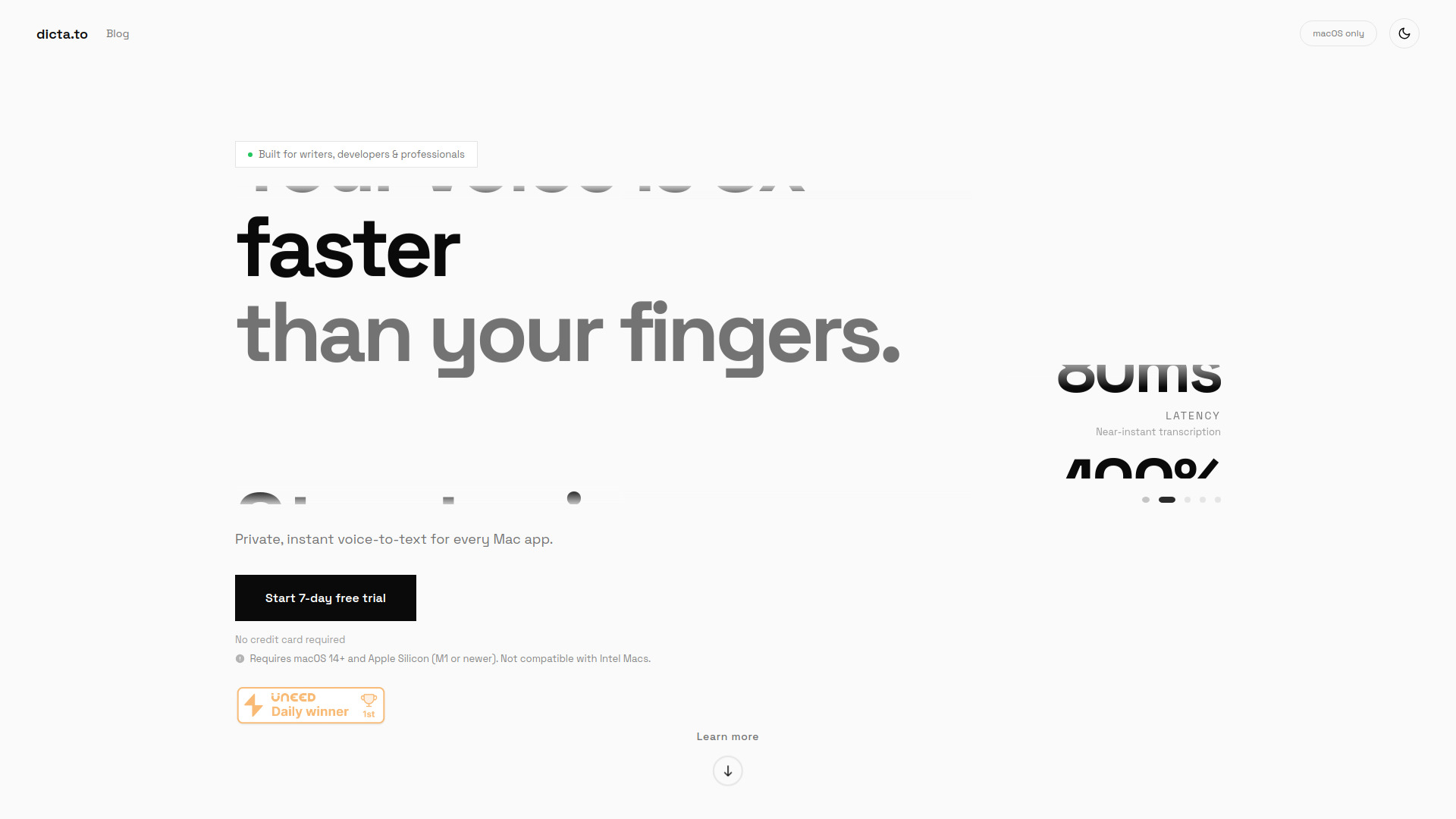 Private, on-device voice-to-text dictation app for Mac with no cloud processing.