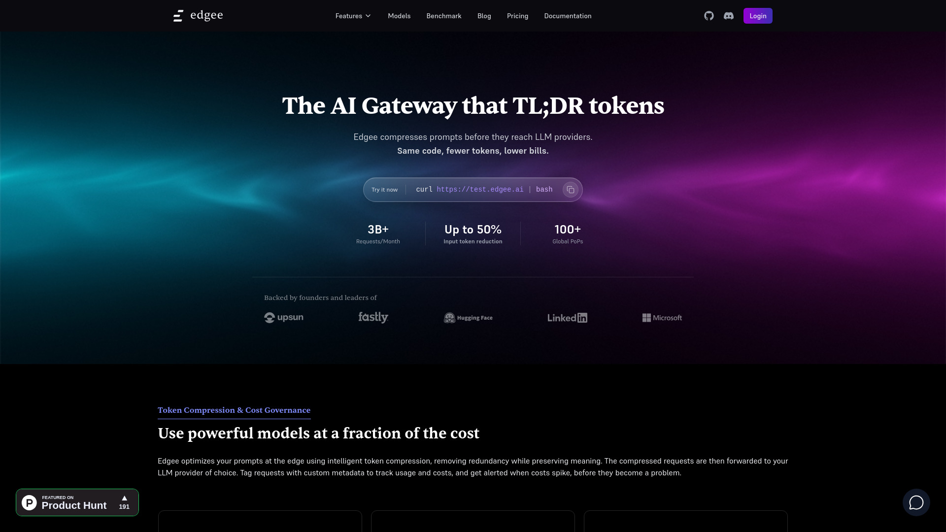 AI gateway reducing LLM costs by 50% through edge-native token compression.