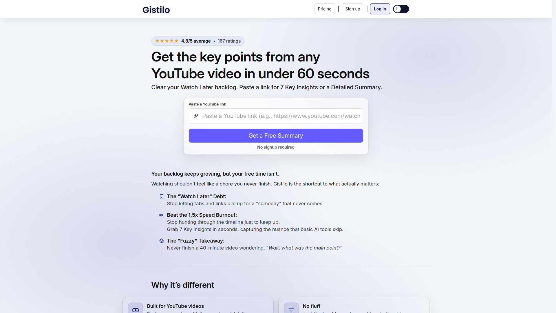 Clear your Watch Later backlog fast. Gistilo delivers 7 Key Insights or a Detailed Summary for any YouTube video in under 60 seconds. Pro adds optional fact-checking with cited sources.