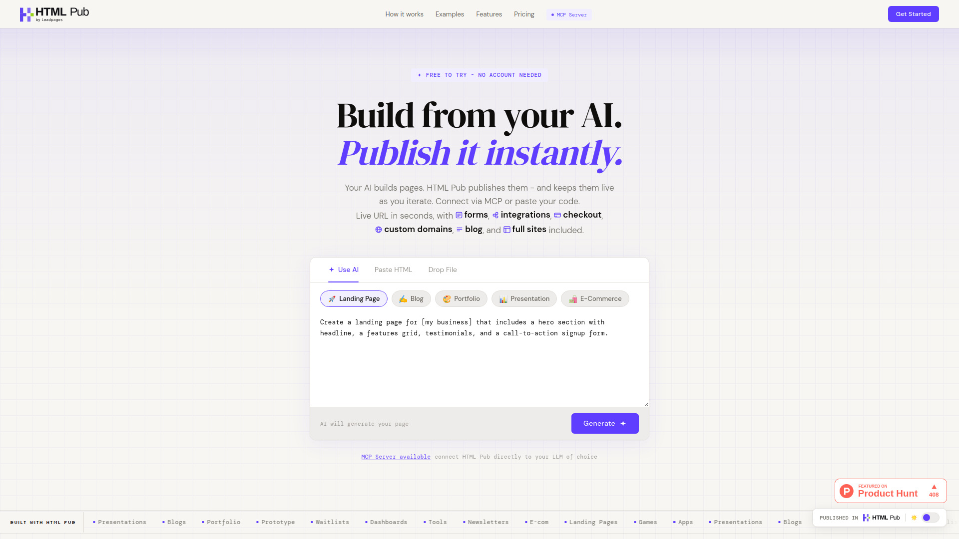 Publish AI-generated HTML instantly via MCP or code pasting with built-in hosting.