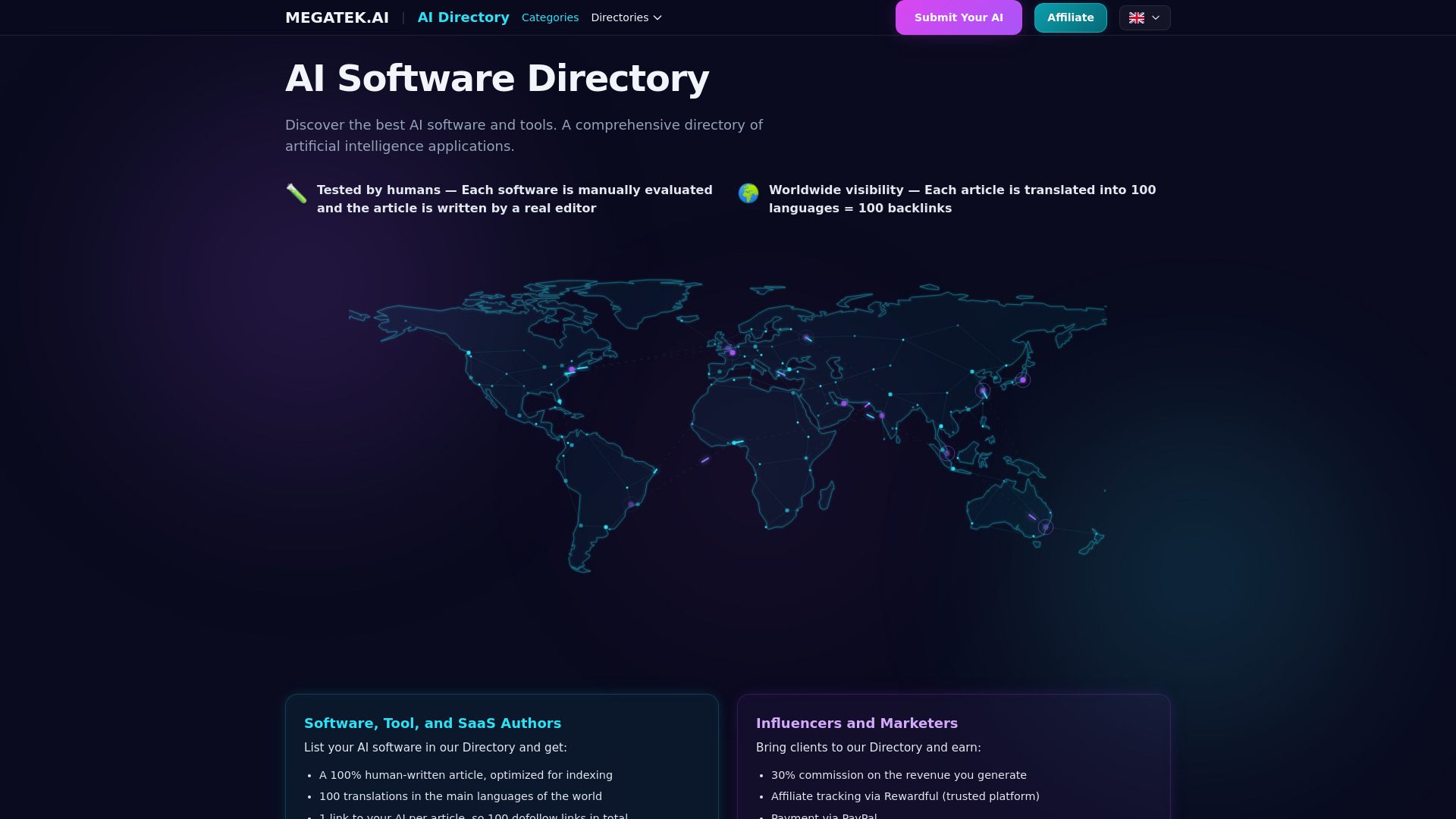 The world's first AI directory that speaks your language — all 100 of them. From English to Yorùbá, from हिन्दी to العربية, MEGATEK.AI gives your AI tool instant visibility across every continent. Submit once, get discovered everywhere. 🌍