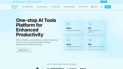 Nova AI Toolkit is a comprehensive platform integrating various AI tools for writing, studying, emailing, diagramming and PDF processing.