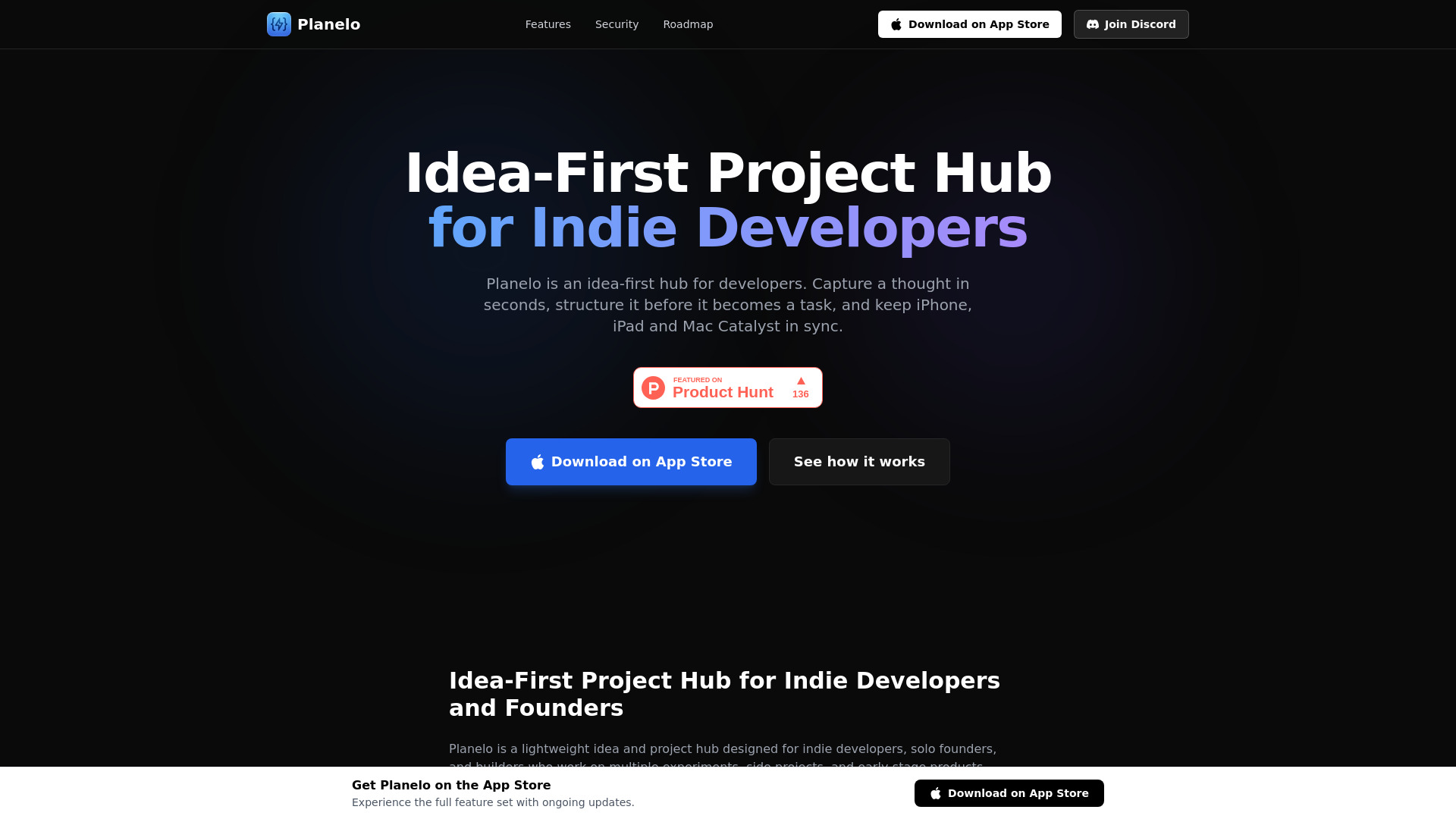 Idea-first project hub with APIs for indie developers and founders.