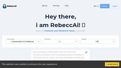 Evaluate and validate your business and startup ideas and create a business plan within seconds. Our AI technology revolutionizes your evaluation process and helps you to make your idea better. Create a compelling business plan with RebeccAi, an AI-powered idea evaluation tool designed to fast track the process of evaluating, assessing, and improving business ideas.