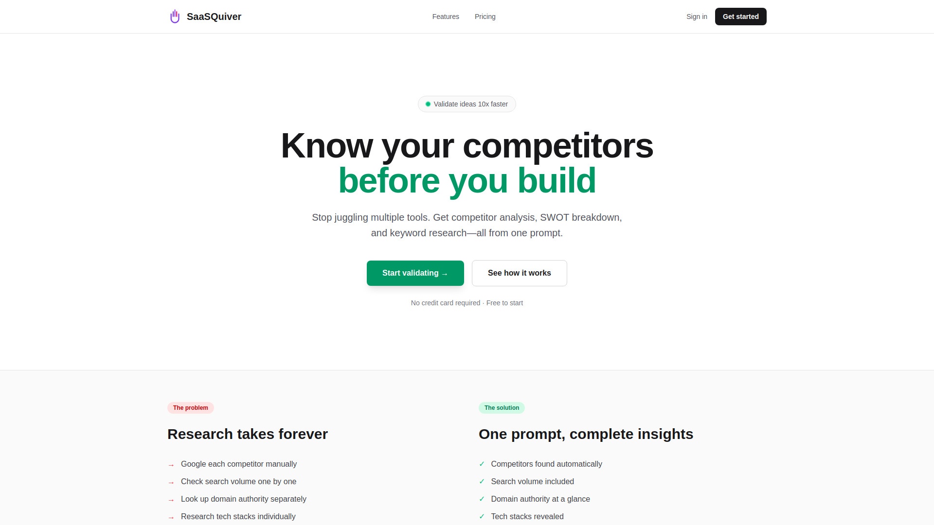 Validate SaaS ideas instantly with competitor analysis, SWOT, and keyword research from one prompt.