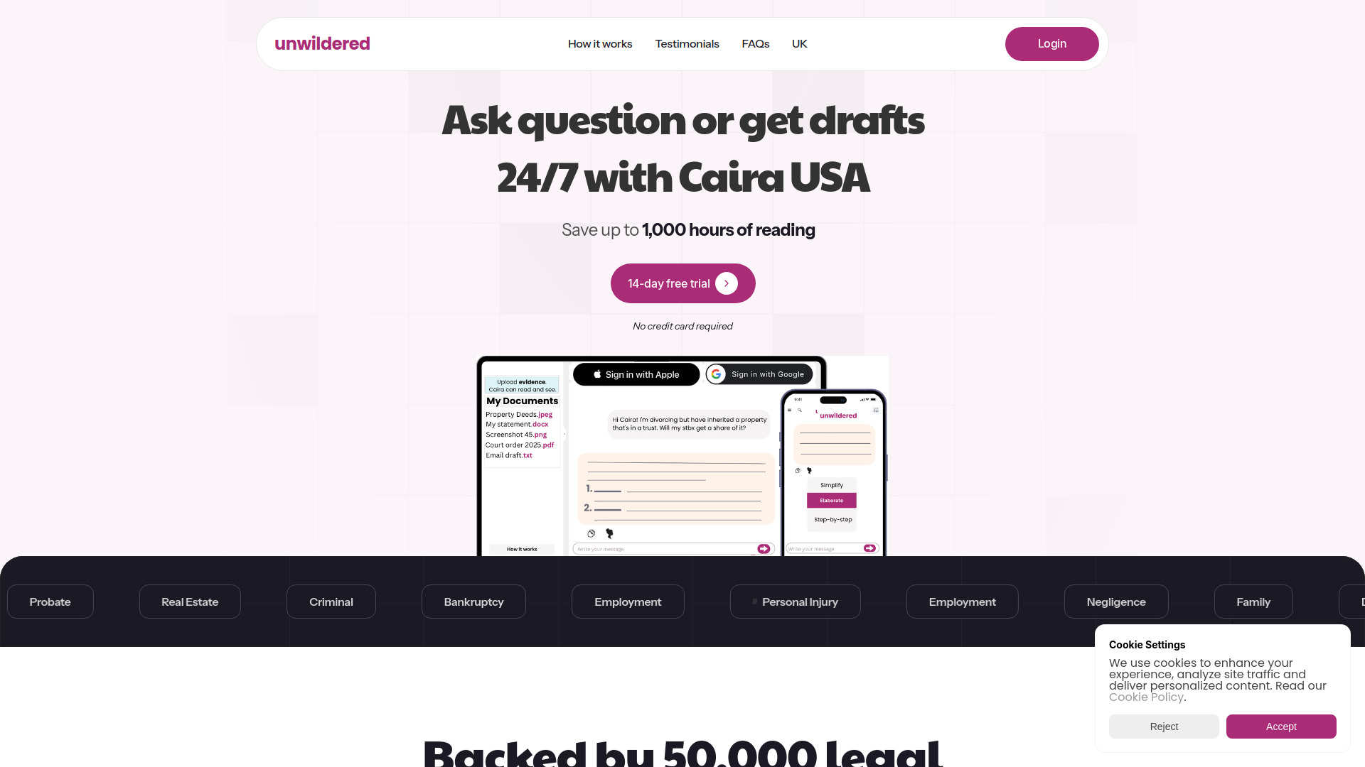 Unwildered brings you Caira, an AI-powered legal assistant designed to make law accessible, easy to understand, and affordable for everyone in the United States. Whether you are dealing with a landlord who won't fix a leak, navigating a complex divorce, or trying to understand a startup business contract, Caira provides instant answers and high-quality drafts in seconds. Most people feel anxious and overwhelmed when they see legal documents or strange terminology. Unwildered was built to change that. For just $21 a month, you get a 24/7 legal copilot on your phone, tablet, or desktop. No more waiting days for an expensive lawyer or losing sleep over a document you don't understand. Caira is powered by the same cutting-edge generative AI models as ChatGPT, but with a critical difference: she is directly backed by a verified database of more than 50,000 legal documents from across all 50 U.S. states. This includes county, state, and federal laws, ensuring that the help you get is accurate, localized, and relevant.