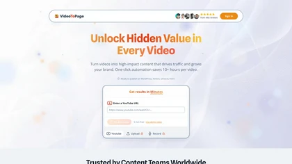 This tool turns any video or audio into a blog post, article, or social media post using. Record or Upload or drop a YouTube link to get started.