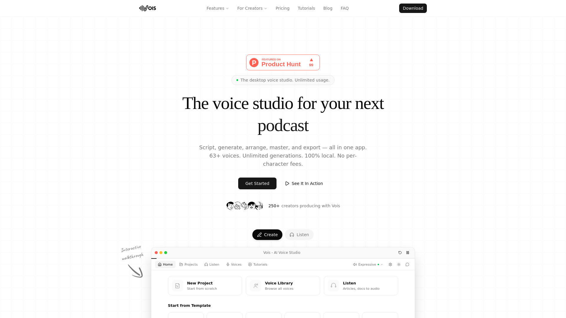 Offline desktop AI voice studio with unlimited generation, voice cloning, and multi-track mastering.